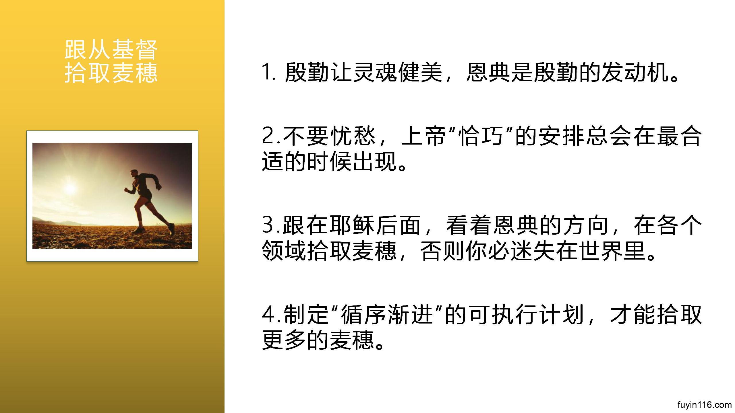 求主让每一个听众,从“拾取麦穗”中得重要的提醒,知道怎样成为一个紧跟基督,成为一个生活目标真正清晰坚定的人。