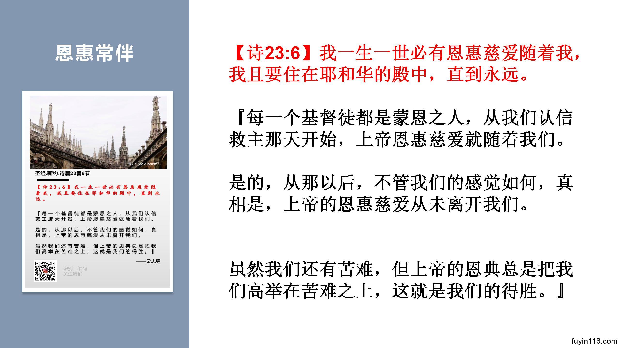 求主祝福我们的《诗篇23篇》系列讲道录音,让我们所讲的,能帮助弟兄姊妹看见基督,能让更多的心灵得到安慰和激励。