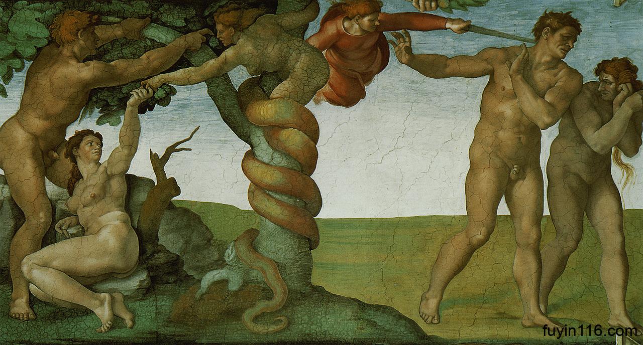 始祖堕落后,上帝来到伊甸园寻找他们。