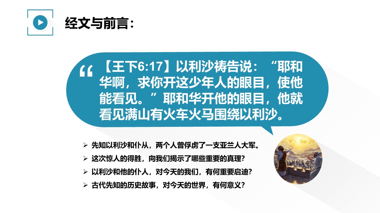 伟大的先知以利沙,曾经和他的仆人,两个人俘虏了亚兰人的一支大军。