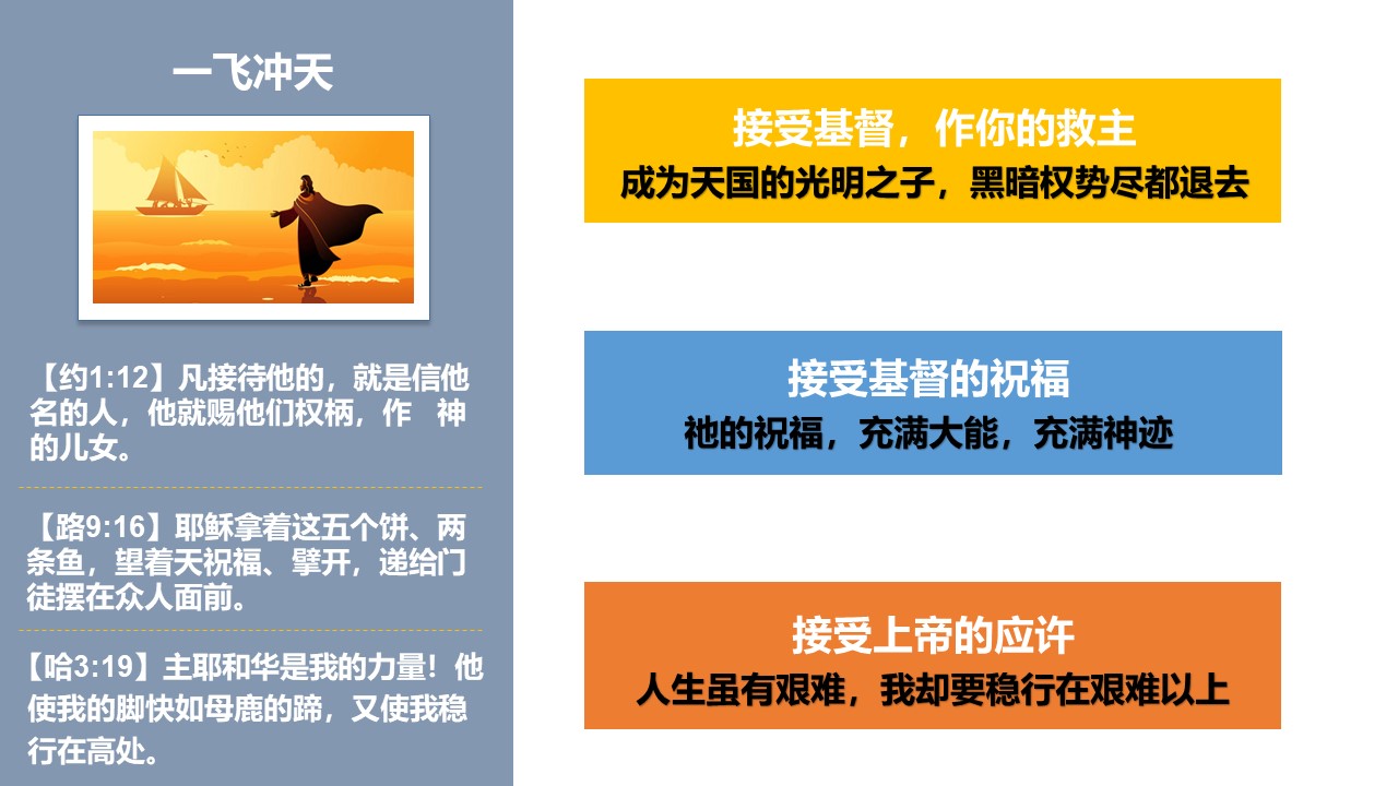 感谢你,你如此顾念我,你知道我心中并没有放弃理想,你愿意塑造我,给我更美的人生追求,让我“一飞冲天”。 我 (你的名字)愿意做出我人生中最重要的决定——接受你的独生爱子耶稣基督的救赎,借着基督,让我获得“天国子民”的身份,得到上帝的祝福,不再被世界耗尽我的生命 我 (你的名字)愿意接受主基督的救恩,愿主耶稣带领我,让我的生命不断升华,让我的理想,可以插上“属天的翅膀”。 我也愿意把自己的一切软弱过犯,都交给耶稣,愿主把这些我生命中的重担都拿走,让我接下来的人生都可以卸下重担,充满了最强的突破力,可以稳行在高处。 阿爸父啊,求你祝福我 (你的名字),在我接下来的人生中,因为被你祝福,可以稳行在人生的艰难之上,成为众人的祝福和帮助。 我 (你的名字)承认,我还有很多软弱和迷茫,还有很多要成长的地方,求天父怜恤我,让我开始谦卑学习你的《圣经》,能明白更多福音真理,求你为我安排合适的基督教会,让我能在圣徒的群体中,越来越认识你的生命之道,让我的灵魂就越发的强壮。 我 (你的名字)承认,在我接下来的人生历程中,必然还有软弱跌倒的时候,求你按照你的信实和慈爱,总是伸手搀扶我,让我总是能突破出来,得胜有余。 最重要的,求阿爸父上帝你祝福我 (你的名字),让我能更深地认识耶稣基督的福音,让我能越来越认识自己的“天国子民”的身份,帮助更多人归向基督,荣耀你的圣名。 如此感恩、祷告和祈求,是奉耶稣的圣名,阿们!