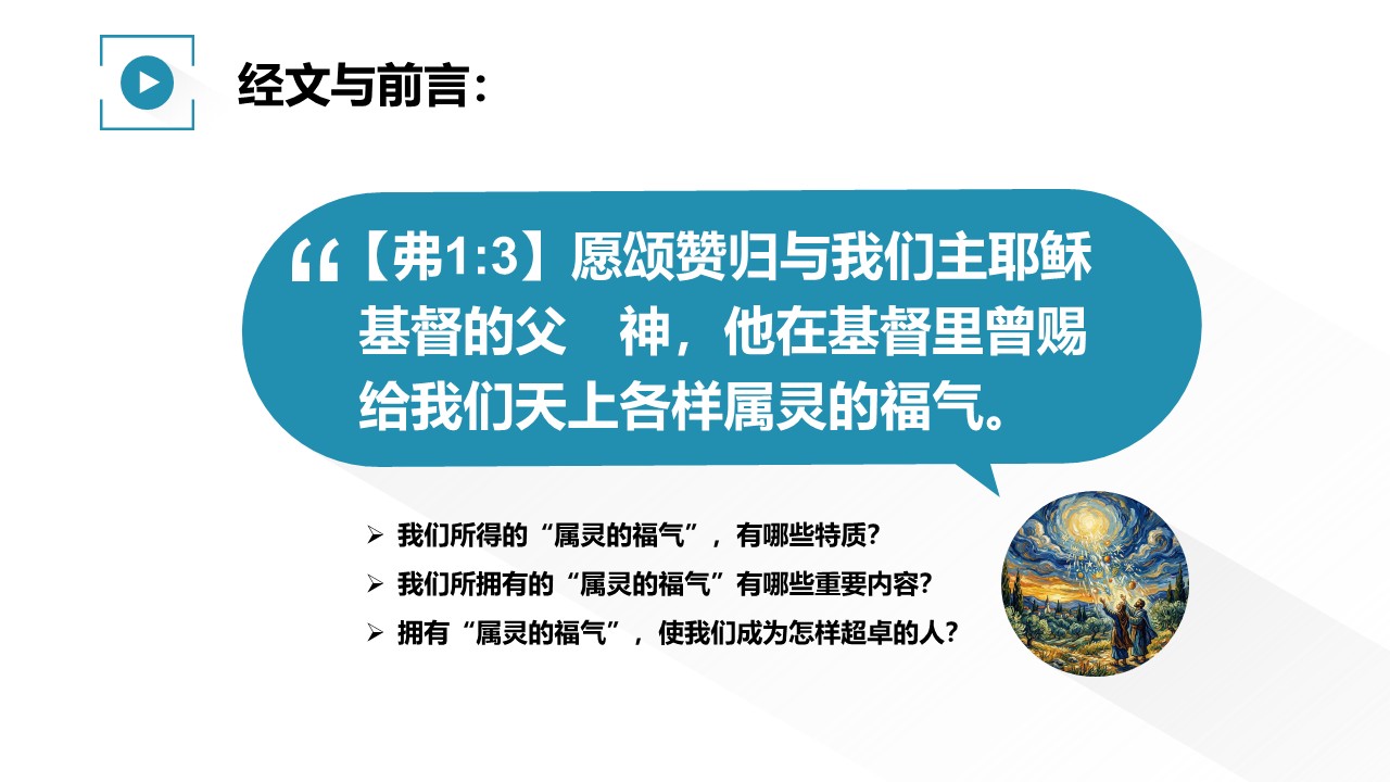 在以弗所书里,保罗第一次赞美神,是因祂赐福给我们“各样的属灵福气”。