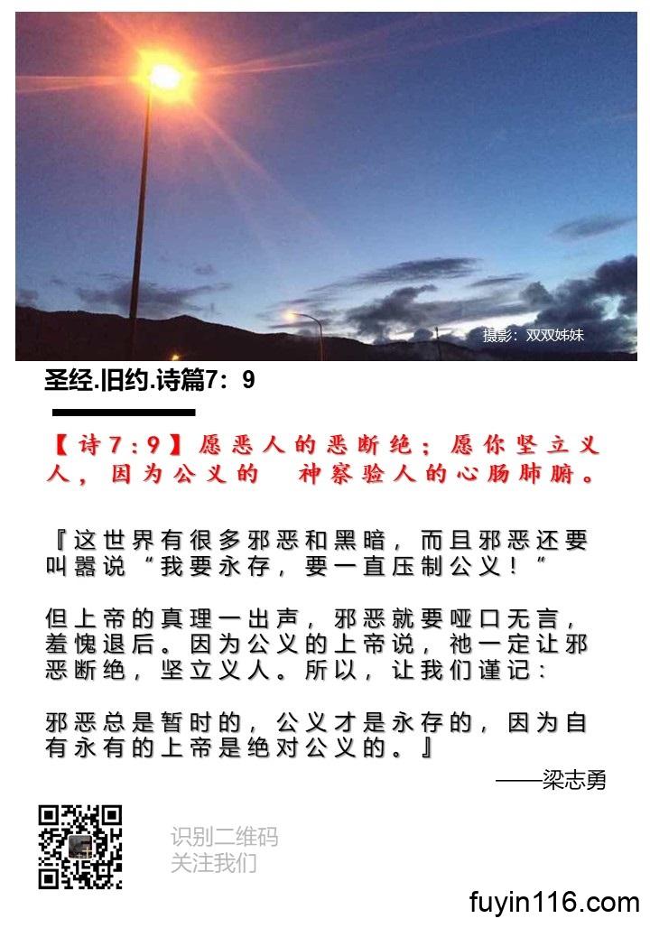 【诗7:9】愿恶人的恶断绝;愿你坚立义人,因为公义的 神察验人的心肠肺腑。 《什么最长久?》 作者:梁志勇牧师 朗诵:徐辉姊妹 【诗7:9】愿恶人的恶断绝;愿你坚立义人,因为公义的 神察验人的心肠肺腑。 『这世界有很多邪恶和黑暗,而且邪恶还要叫嚣说“我要永存,要一直压制公义!” 但上帝的真理一出声,邪恶就要哑口无言,羞愧退后。 因为公义的上帝说,祂一定让邪恶断绝,坚立义人。 所以,让我们谨记:邪恶总是暂时的,公义才是永存的,因为自有永有的上帝是绝对公义的。』 我们在天上的父…