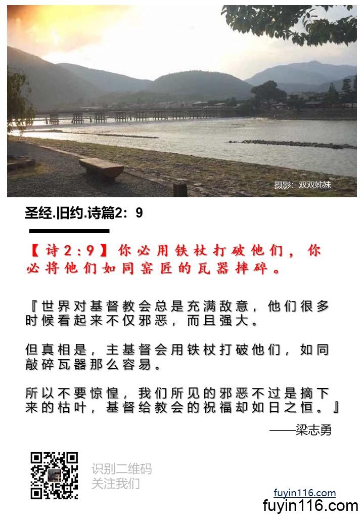 《看!悬殊的力量对比》 作者:梁志勇牧师 朗读:徐辉姊妹 【诗2:9】你必用铁杖打破他们,你必将他们如同窑匠的瓦器摔碎。 【诗2:9】你必用铁杖打破他们,你必将他们如同窑匠的瓦器摔碎。 『世界对基督教会总是充满敌意,他们很多时候看起来不仅邪恶,而且强大。 但真相是,主基督会用铁杖打破他们,如同敲碎瓦器那么容易。 所以不要惊惶,我们所见的邪恶不过是摘下来的枯叶,基督给教会的祝福却如日之恒。』 爱我们的天父,我们感谢和赞美你, 感谢你开我们属灵的眼睛,让我们可以珍视《圣经》的真理,并从这些生命之道中得到灵魂的粮食。 特…