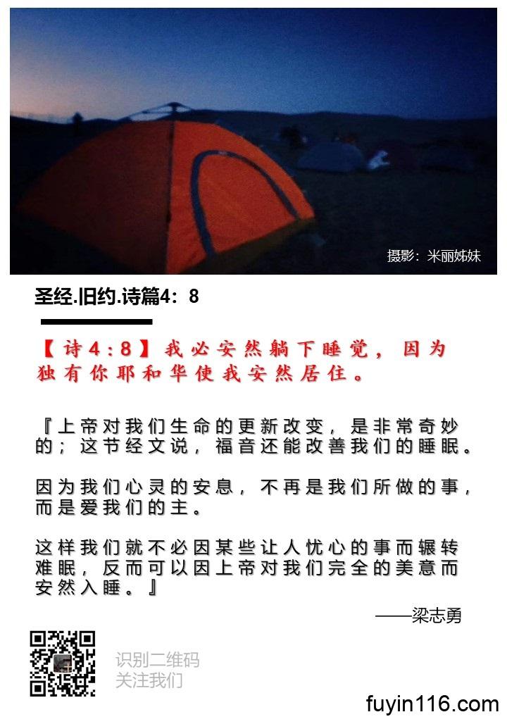 【诗4:8】我必安然躺下睡觉,因为独有你耶和华使我安然居住。 《如何改善你的睡眠?》 作者:梁志勇牧师 朗读:徐辉姊妹 【诗4:8】我必安然躺下睡觉,因为独有你耶和华使我安然居住。 『上帝对我们生命的更新改变,是非常奇妙的;这节经文说,福音还能改善我们的睡眠。 因为我们心灵的安息,不再是我们所做的事,而是爱我们的主。 这样我们就不必因某些让人忧心的事而辗转难眠,反而可以因上帝对我们完全的美意而安然入睡。』 亲爱的天父,我们感谢和赞美你, 感谢赞美你,你赐给我们的恩典奇妙非常…