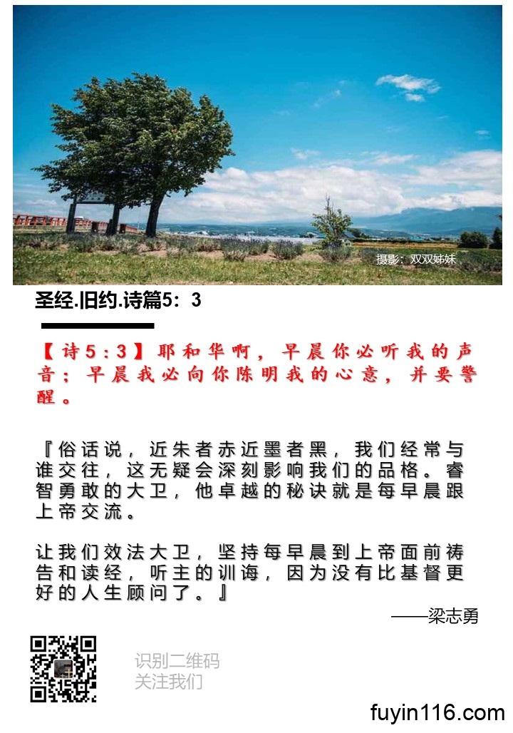【诗5:3】耶和华啊,早晨你必听我的声音;早晨我必向你陈明我的心意,并要警醒。 《谁是最好的顾问?》 作者:梁志勇牧师 朗读:徐辉姊妹 【诗5:3】耶和华啊,早晨你必听我的声音;早晨我必向你陈明我的心意,并要警醒。 『俗话说,近朱者赤近墨者黑,我们经常与谁交往,这无疑会深刻影响我们的品格。 睿智勇敢的大卫,他卓越的秘诀就是每早晨跟上帝交流。 让我们效法大卫,坚持每早晨到上帝面前祷告和读经,听主的训诲,因为没有比基督更好的人生顾问了。』 亲爱的主耶稣基督,我们感谢和赞美你, 感谢你赐给我们…