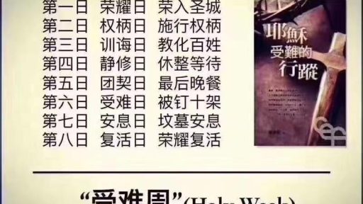 我们知道,基督教会有一个美好的传统,就是在复活节前一周,就是受难周,默想主基督的救恩,按照主基督从荣入圣城的那一天开始,到上十字架、受死、复活,总共8天,每天一个主题,帮助圣徒更清晰地看见救主基督。 这八天分别是: 第一日 荣耀日(周日) 第二日 权柄日(周一) 第三日 训诲日(周二) 第四日 安静日(周三) 第五日 团契日(周四) 第六日 受难日(周五) 第七日 安息日(周六) 第八日 复活日(周日)   这个总计8天受难周的默想,在近两千年的教会历史中,激励了亿亿万万的基督徒,定睛我们的救主,更认识福…