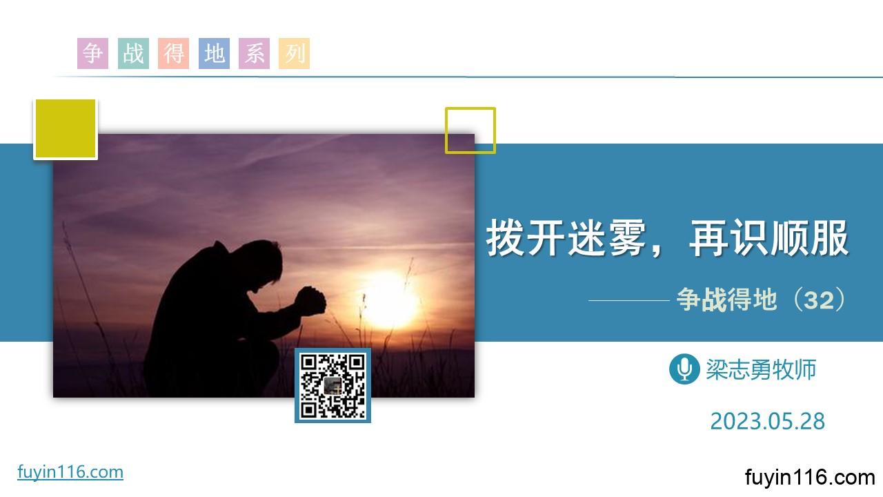 “顺服基督”是一个可有可无的话题,还是一个极其重要的主题? 有哪些仇敌散布的迷雾,来拦阻我们“顺服基督”? 在福音的聚光灯下,“顺服”的真相里,蕴含着怎样令人震惊的真理? 愿上帝的祝福借着祂的真道,更多地临到每一个认真聆听的灵魂。 欢迎收听: 《拨开迷雾,再识顺服》 您也可以点击下面的链接,重温之前的信息: 《争战得地》系列 点击音频媒体前面的小三角“►”就可以播放 墙外观看: 我们的阿爸天父,感谢赞美你 感谢你赐给我们《圣经》真理,让我们可以领受你恩典和真理的祝福。 我们…