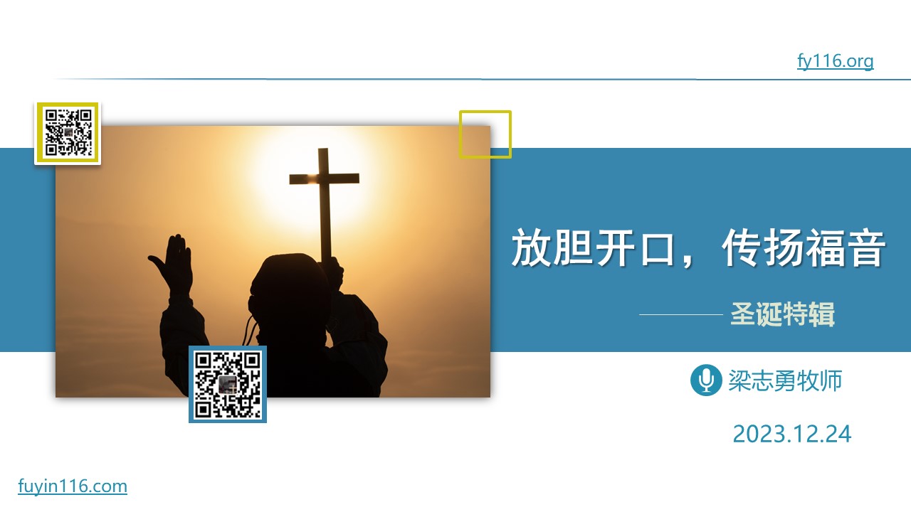 12月24日的主日,正好也是平安夜,我们有一次“圣诞特辑”的专题分享。 我们怎样才能放胆开口,传扬福音? 我们应该怎样放胆开口,向谁开口? 我们应该怎样放胆传扬福音? 愿上帝的祝福借着祂的真道,更多地临到每一个认真聆听的灵魂。 欢迎您收听: 《放胆开口,传扬福音》 https://luomashu.top/tfjo 点击音频媒体前面的小三角“►”就可以播放: 墙外观看: 我们的阿爸天父,感谢赞美你 感谢你赐给我们《圣经》真理,让我们可以领受你恩典和真理的祝福。 我们特别感谢…