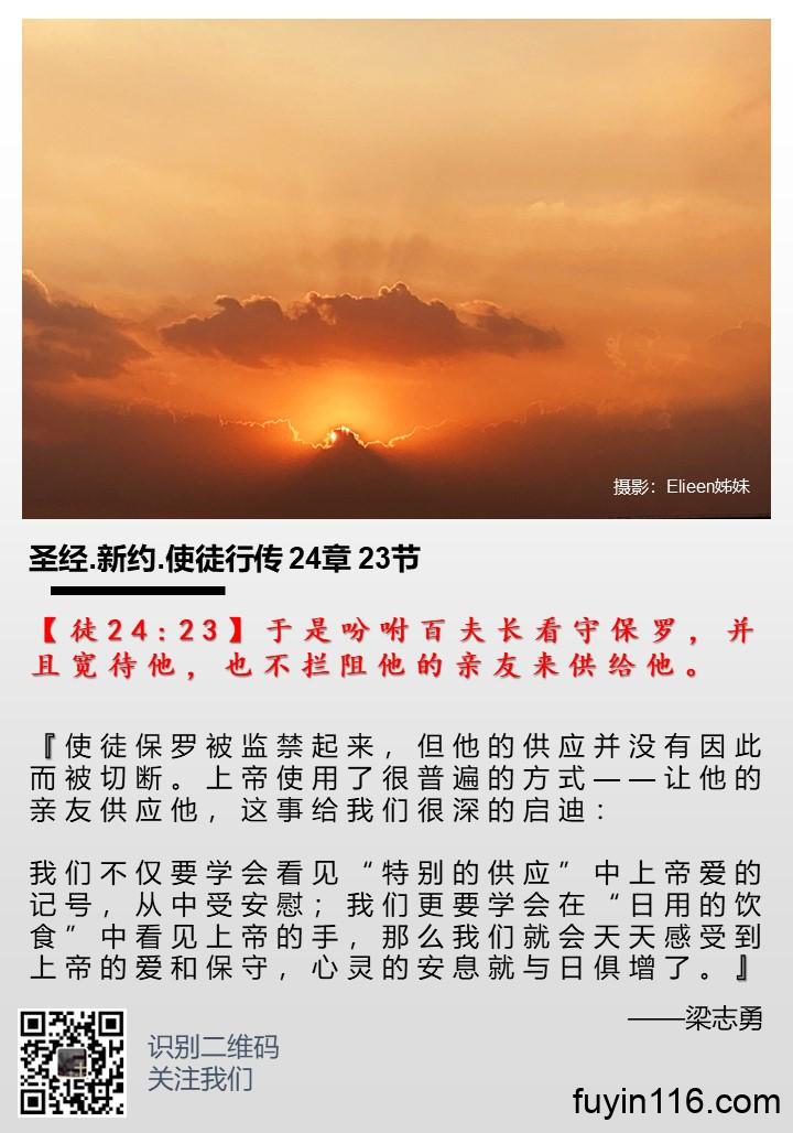 【徒24:23】于是吩咐百夫长看守保罗,并且宽待他,也不拦阻他的亲友来供给他。 《上帝怎样供应我们?》 作者:梁志勇牧师 朗诵:倩文师母 上帝怎样供应我们? (梁志勇) 【徒24:23】于是吩咐百夫长看守保罗,并且宽待他,也不拦阻他的亲友来供给他。 请注意,使徒保罗被监禁起来,但他的供应并没有因此而被切断。 他得到供应的方式,是非常普遍的——“亲友供给”。 我们记得旧约伟大的先知以利亚,上帝曾用乌鸦供应他,这真是伟大的神迹. 但让我们不要以为只有“乌鸦的供养”才是神的作为,上帝供应我们的方式既包括了“…