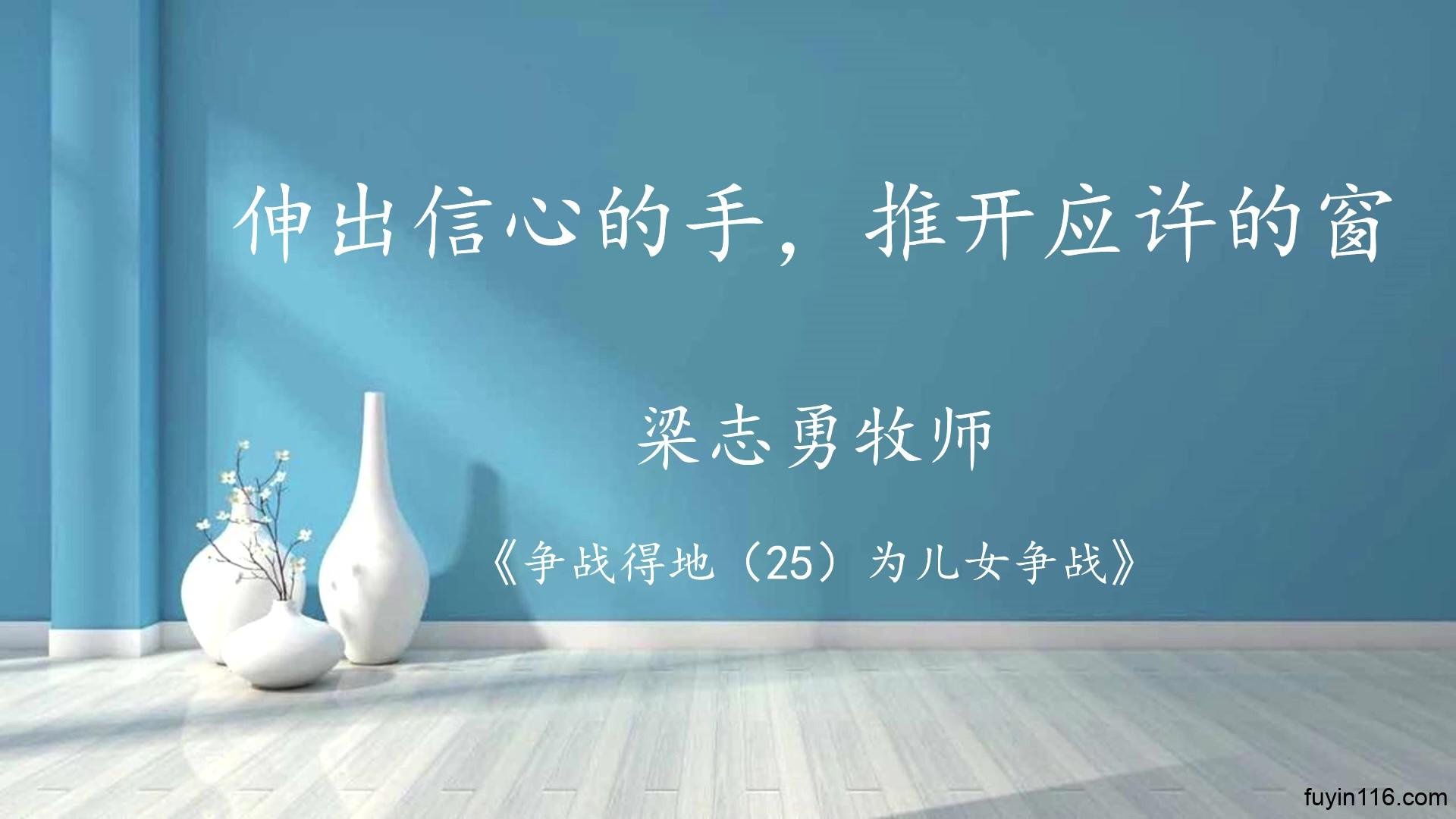 在我们儿女的头上, 有上帝的神圣应许。 这神圣应许之窗, 只能用信心之手推开; 所以,让我们用信心, 看待自己的儿女; 也用信心为儿女争战。 ——梁志勇《为儿女争战》 《争战得地(25)为儿女争战》 《福音布道》系列 《争战得地》系列 《福音观影会》系列 《旧约里的福音》系列 《祭坛系列》讲道 《因信称义》系列讲道(更新中) 《希伯来书》系列讲道(全) 《出埃及记》系列讲道(全) 《讲道信息》汇总 《梁牧清风》圣经默想 《五饼二鱼》讲道剪辑 &n…