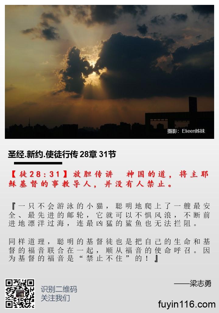 【徒28:31】放胆传讲 神国的道,将主耶稣基督的事教导人,并没有人禁止。 《禁止不住的福音》 作者:梁志勇牧师 朗诵:倩文师母 禁止不住的福音 (梁志勇) 【徒28:31】放胆传讲 神国的道,将主耶稣基督的事教导人,并没有人禁止。 当犹太人诬陷保罗,当他们设计杀害保罗,当他们想方设法把保罗投入监牢,我们知道背后都是魔鬼的诡计,看起来魔鬼这一系列拦阻福音的诡计又恶毒,又猛烈,针对性极强。 福音的工作,看起来要大受影响,甚至可能大大退后了。 但实际的结果呢? 30节说 “保罗在自己所租的房…