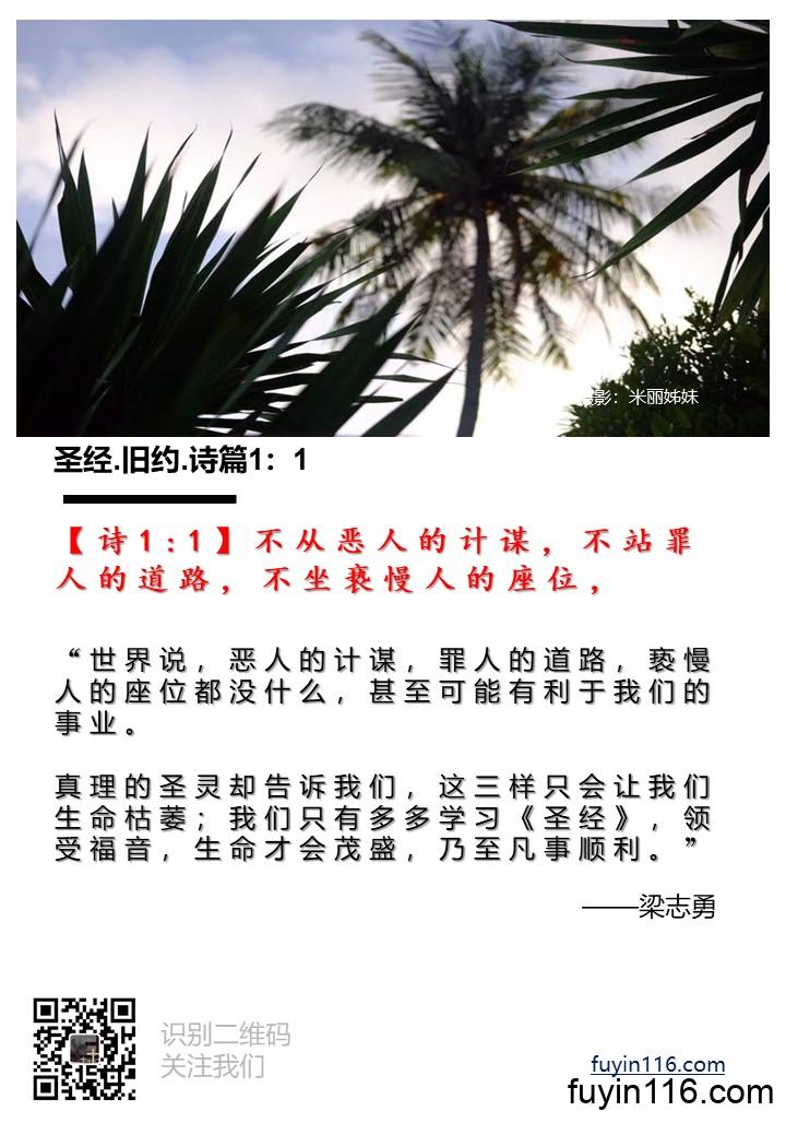 【诗1:1】不从恶人的计谋,不站罪人的道路,不坐亵慢人的座位, 《注意!这亮起的三盏红灯》 作者:梁志勇牧师 朗读:徐辉姊妹 【诗1:1】不从恶人的计谋,不站罪人的道路,不坐亵慢人的座位, “世界说,恶人的计谋,罪人的道路,亵慢人的座位都没什么,甚至可能有利于我们的事业。真理的圣灵却告诉我们,这三样只会让我们生命枯萎;我们只有多多学习《圣经》,领受福音,生命才会茂盛,乃至凡事顺利。” 爱我们的天父,我们感谢和赞美你! 感谢你开我们属灵的眼睛,让我们可以珍视《圣经》的真理,并从这些生命之道中得到灵魂的粮食。 特别感谢…