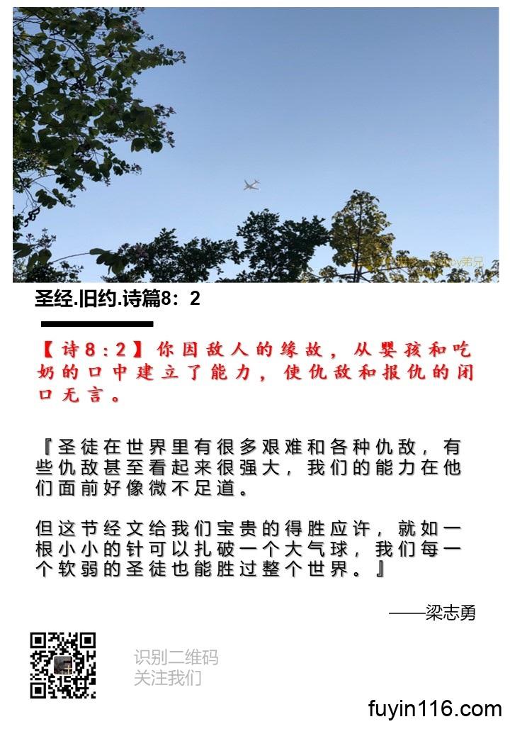 【诗8:2】你因敌人的缘故,从婴孩和吃奶的口中建立了能力,使仇敌和报仇的闭口无言。 《刺破大气球的小针》 作者:梁志勇牧师 朗诵:徐辉姊妹 【诗8:2】你因敌人的缘故,从婴孩和吃奶的口中建立了能力,使仇敌和报仇的闭口无言。 『圣徒在世界里有很多艰难和各种仇敌,有些仇敌甚至看起来很强大,我们的能力在他们面前好像微不足道。 但这节经文给我们宝贵的得胜应许,就如一根小小的针可以扎破一个大气球,我们每一个软弱的圣徒也能胜过整个世界。』 我们在天上的父,我们感谢和赞美你, 你赐给我们的每一句话都是那么奇妙,虽然用词都是简洁的…
