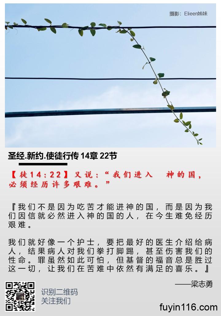 【徒14:22】又说:“我们进入 神的国,必须经历许多艰难。” 《为何信徒要经历艰难?》 作者:梁志勇牧师 朗诵:倩文师母 为何信徒要经历艰难? (梁志勇) 【徒14:22】又说:“我们进入 神的国,必须经历许多艰难。” 从初代教会到如今,基督的教会总是不断经历艰难。 为什么基督徒要经历艰难,使徒在这里说“我们进入 神的国,必须经历许多艰难。”是什么意思?他主张必须受苦才能得救吗? 不!我们得救,只要借着信,我们只要信耶稣,就必得永生,不在乎我们是否为信仰受苦。你为信仰受了再多的苦,也不能增加你得救的…